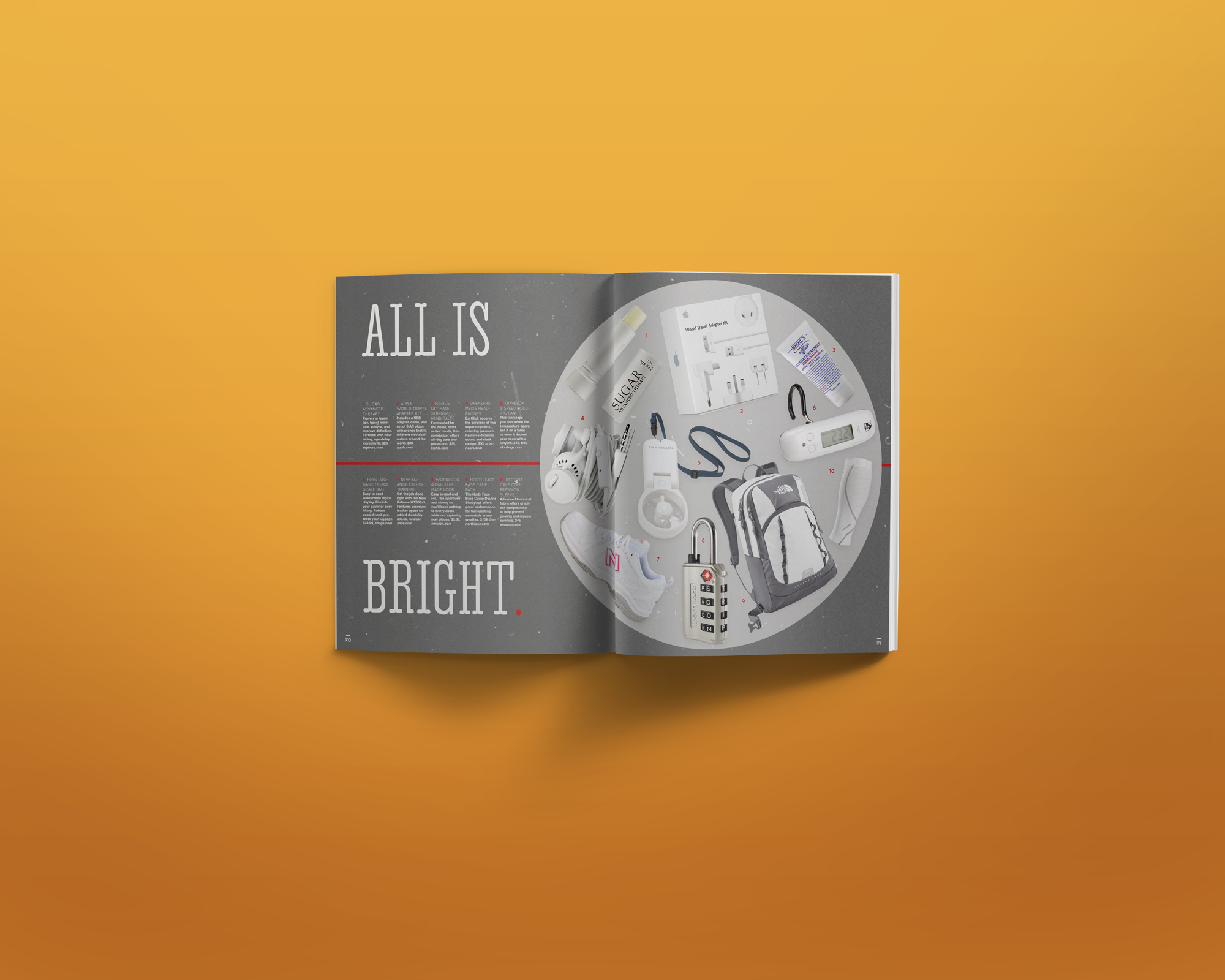 Get Lost. Wander Far. The adventurous theme of the magazine and the articles featured within this issue are reflected in the unexpected use of layout design. Taking into account the younger skew of the target market, the design and layout of each page highlights the idea of the "Get Out There" lifestyle with bright colors and bold graphics; while still keeping copy simple, clean, and ultimately readable.